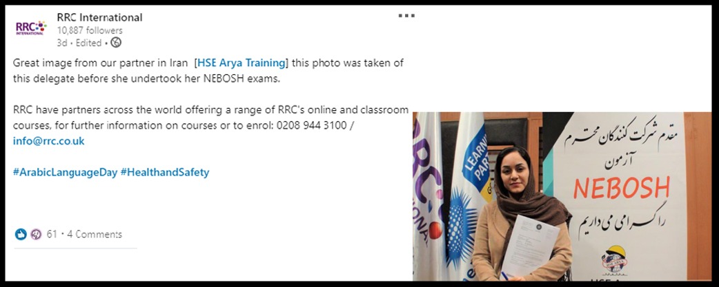 RRC International در شبکه های اجتماعی خود در LinkedIn و Instagram به شرکت HSE Arya به عنوان پارتنر خود در ایران اشاره نموده و برخی از عکس های گرفته شده در ایران از نفرات شرکت کننده در آزمون را منتشر نموده است.